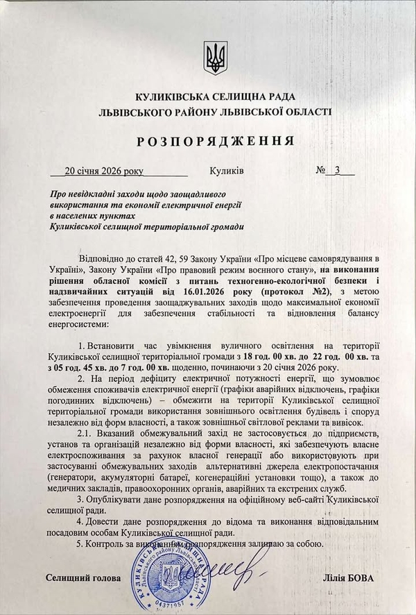 Шановні жителі Куликівської селищної територіальної громади! Відповідно до розпорядження Куликівського селищного голови від 20 січня 2026 року №3 «Про невідкладні заходи щодо заощадливого використання та економії електричної енергії в населених пунктах Куликівської селищної територіальної громади», на території громади запроваджуються додаткові заходи з раціонального використання електроенергії.