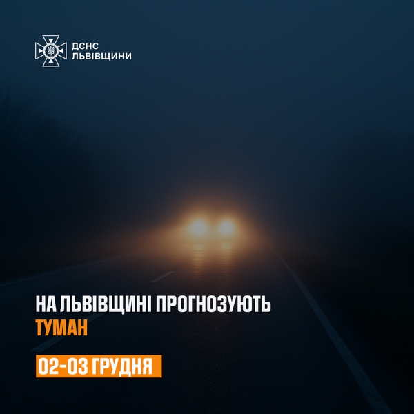 За повідомленням Львівського регіонального центру з гідрометеорології України, по території Львівської області ввечері 02 грудня і вночі та в першій половині дня 03 грудня прогнозується туман з видимістю 200 – 500 метрів. Надзвичайники Львівщини закликають громадян бути обережними та відповідально ставитись до власного життя та життя оточуючих.