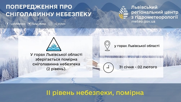 З 31 січня по 02 лютого у горах Львівщини очікується помірна сніголавинна небезпека, що відповідає другому рівню. Це означає, що можливі сходження лавин при значних додаткових навантаженнях, особливо на крутих схилах. Туристам та місцевим жителям рекомендується бути обережними та уникати небезпечних ділянок.