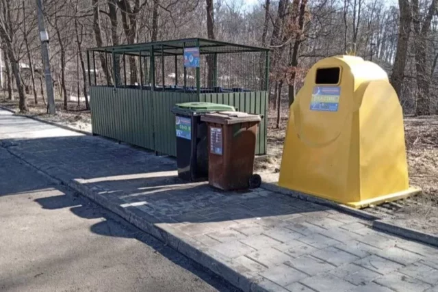 Новий майданчик для роздільного збору сміття розташований біля дороги на вимощеній плиткою ділянці. Тут стоять великий жовтий контейнер для пластику та два менші баки — зелений і коричневий. Позаду них знаходиться огороджений майданчик із металевим каркасом.